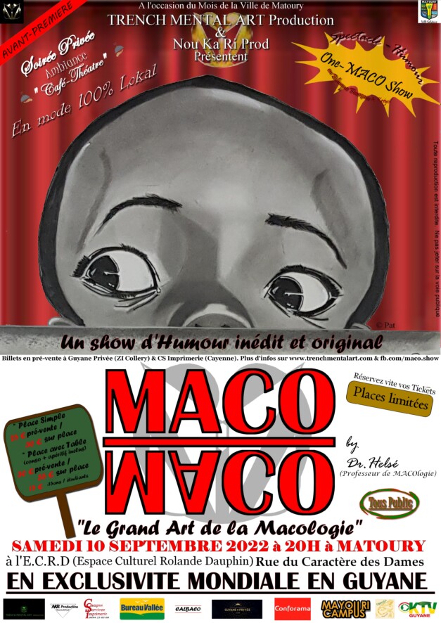Rendez-vous demain pour ce One-Maco Show, extrêmement drôle ! Le Samedi 10 Septembre 2022 à l’ECRD (Espace Culturel Rolande Dauphin) à 20h Tickets disponible en pré-vente sur : guyaneprivee.com Plus d’informations sur la page du One-MACO Show ou sur : fb.com/maco.show