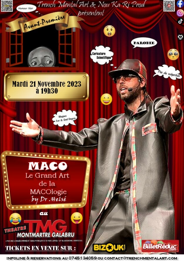 Après une année riche en émotions ! Et le Début de la Tournée de MACO : Le Grand Art de la MACOlogie by Dr.Helsé en France. Vous avez pu découvrir le MACO-Show avec 3 représentations exclusives à Paris, au Théatre Montmartre-Galabru dans le 18ème. Pour cette année 2024, nous vous raison encore des surprises et surtout une NOUVELLE DATE pour le MACO-Show le JEUDI 14 MARS 2024 à 20h00 à ANGERS (49) Tickets déjà disponible en prévente sur vos plateformes billetreduc, francebillet, FNAC & Bizouk et en magasins : https://www.billetreduc.com/335897/evt.htm https://www.fnacspectacles.com/artist/dr-helse/ https://www.francebillet.com/billet-sortie/acheter/humoriste-s-maco-le-grand-art-de-la-macologie-man60695-lt.htm https://www.bizouk.com/events/details/maco-le-grand-art-de-la-macologie-by-drh/74480